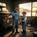 [Verse 1] He was up before the sunrise Coffee in a chipped blue cup Said "Boy That river raised me But it's you that's growin' up" We haul steel down the Ohio Rust on our hands by noon Then we’re back home in the gravel ’Neath a busted porch light moon [Chorus] We got Fateyes sittin’ in the backyard Primer gray and dreams in red Wrenches singin’ like a choir Oil stains where our prayers get said You’re my blood My boy My shadow I’m your old man’s only son Granddad Grandson Side by side Feelin’ like father and son [Verse 2] He points out at that river Says "She’ll take what you don’t tie down" Same thing ‘bout your temper Same thing ‘bout this town But he laughs when the socket slips Grease streaked across my face "Every busted knuckle Kid Puts you right in your place" [Chorus] We got Fateyes sittin’ in the backyard Primer gray and dreams in red Wrenches singin’ like a choir Oil stains where our prayers get said You’re my blood My boy My shadow I’m your old man’s only son Granddad Grandson Side by side Feelin’ like father and son [Bridge] [Guitar leans into a slow Bent-note break] He says "One day I’ll be river dust One day you’ll drive away" Hands me that cold chrome socket Says "Turn it Kid Let it stay" And the frame creaks like it’s talkin’ Old bolts finally comin’ loose Two hearts on the same old rhythm Same sweat Same worn-out boots [Chorus] We got Fateyes runnin’ from the backyard Headlights cuttin’ through the dark Every mile feels like a memory Every shift a little spark You’re my blood My boy My shadow I’m your old man’s only son On that river In this driveway We’re still like father and son [Outro] [Band drops to a hush Slide guitar answering the vocal] River roll on past our story Truck cools down Day is done Two chairs in the dust by Fateyes Granddad Grandson Father and son