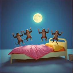 Jump, jump — up so high, Little monkeys touch the sky! Five little monkeys on the bed, Bouncing wild above their heads. One slipped down and hit his head, Mama called the doc and said— “No more monkeys jumping high, No more falling, no more cries! Time to rest, it’s getting late, No more monkeys — time to wait!” Four little monkeys full of play, Laughing loud in a silly way. One tumbled down with a bump, oh dear! Mama said, “Let’s calm it here.” “No more monkeys jumping high, No more falling, no more cries! Time to rest, it’s getting late, No more monkeys — time to wait!” Three little monkeys full of play, Laughing loud in a silly way. One tumbled down with a bump, oh dear! Mama said, “Now it’s time to listen.” “No more monkeys jumping high, No more falling, no more cries! Time to rest, it’s getting late, No more monkeys — time to wait!” Two little monkeys tiring out, Laughing loud in a silly way. One tumbled down with a bump, oh dear! Mama said, “What did I say!” “No more monkeys jumping high, No more falling, no more cries! Time to rest, it’s getting late, No more monkeys — time to wait!” One little monkeys left to play, Laughing loud in a silly way. One tumbled down with a bump, oh dear! Mama said, “Now we go to bed!” “No more monkeys jumping high, No more falling, no more cries! Time to rest, it’s getting late, No more monkeys — time to wait!” Now the moon is shining bright, All is quiet in the night. Five small monkeys tucked in tight, Dreaming till the morning light. Jumping’s fun, but here’s the rule, Beds are made for rest, not tools! Close your eyes, the stars will stay, Tomorrow’s time for more play!