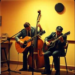 jazz, Hot-club gipsy jazz swing with two acoustic lead guitars trading solos, woody upright bass walking hard, brushes on snare. Live-in-the-room feel: a bit of room reverb, clinking glasses, band shouts. Tempos push and pull for that Django-style swagger; vocals sit upfront and playful, with scatted fills between phrases and a big unison tag at the end., swing