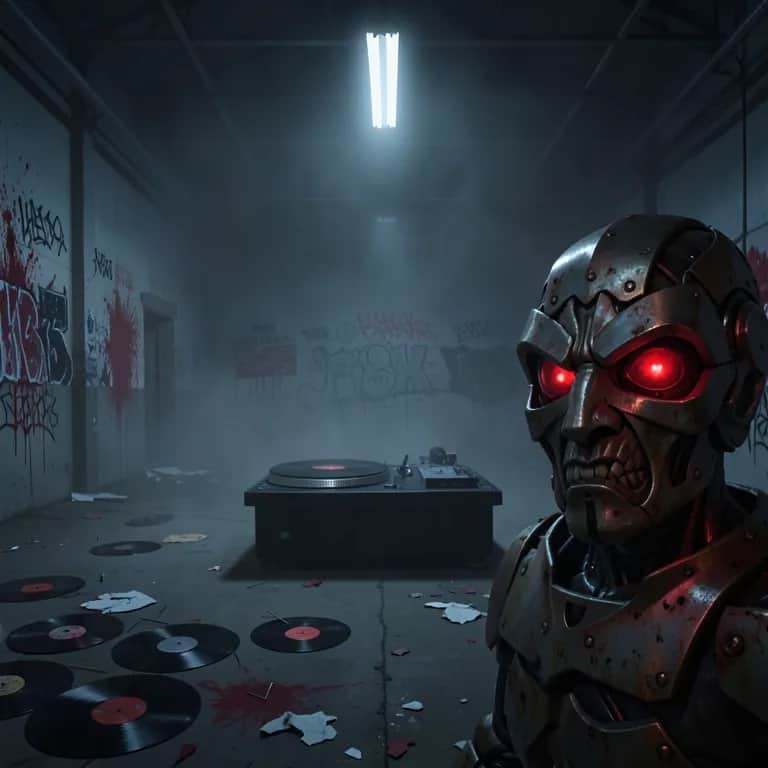 rap, Aggressive horrorcore hybrid: male vocals over pounding hardstyle kicks, distorted 808s, and shrieking dark synths. Verse sections ride a sparse, glitchy underground rap groove with scratching and chopped vocal stutters; chorus explodes with layered gang vocals, horror sound design hits, and sub‑shaking bass drops. Turntable cuts thread through transitions, with eerie theremin and creepy psychobilly guitar stabs in the bridge. Overall energy: relentless, chaotic, battle‑ready., turntablism, underground rap, freestyle, hardstyle, horrorcore, hardcore, dark ambient, vocaloid, noise