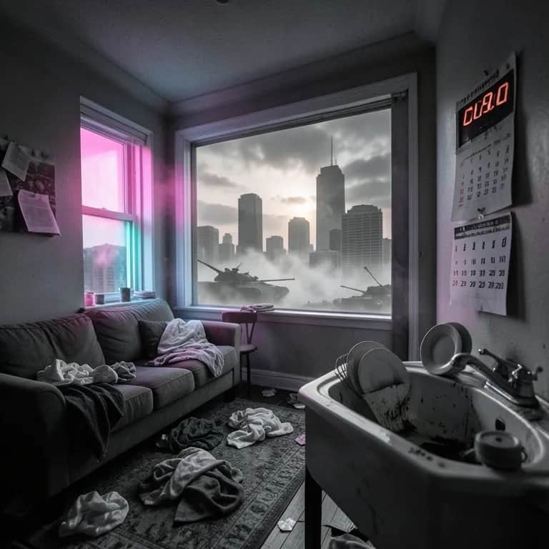 [Verse 1] Scroll the headlines World's on fire again Talking heads scream Like it's the bitter end Got a push alert For the end of days But the sink's full of dishes And the rent's still late [Pre-Chorus] Is this apocalypse Or just a Monday My brain's a traffic jam In the subway They say it's over On the TV crawl But my mom keeps texting "Did you call?" [Chorus] We might be on the brink of World War Three But the laundry still ain't folding itself for me If the sky falls down I’ll be in aisle nine Buying bleach and snacks Like I’ll be fine If this is how the whole world ends I’ll be sorting lights and darks again Dancing in my kitchen While the sirens scream Caught between a spin cycle And a fever dream [Verse 2] Gas mask chic On the fashion feed Talk of bunkers And emergency seeds Got an air raid drill On the evening news But my trash goes out Tuesday What else can I do [Pre-Chorus] Is this the big one Or just a bad year My cart’s full of coupons And a hint of fear They say "stock up On canned relief" I'm like "add coffee And some floss for my teeth" [Chorus] We might be on the brink of World War Three But the laundry still ain't folding itself for me If the sky falls down I’ll be in aisle nine Buying bleach and snacks Like I’ll be fine If this is how the whole world ends I’ll be sorting lights and darks again Dancing in my kitchen While the sirens scream Caught between a spin cycle And a fever dream [Bridge] [Beat drops to half-time Vocal close and dry] If the power cuts I’ve got candles and wine If the timeline melts I’ll still stand in line If the ceiling cracks And the ground starts to shake I’ll be scrubbing that ring Around the bathtub drain (hey!) [Chorus] We might be on the brink of World War Three But the laundry still ain't folding itself for me If the sky falls down I’ll be in aisle nine Buying bleach and snacks Like I’ll be fine If this is how the whole world ends I’ll be sorting lights and darks again Dancing in my kitchen While the sirens scream Caught between a spin cycle And a fever dream [Outro] Turn the news down low Turn the music up If it’s all gonna blow I’ll still wash this cup End of everything? Guess we’ll wait and see I’ve got dust on the shelf And a war on TV
