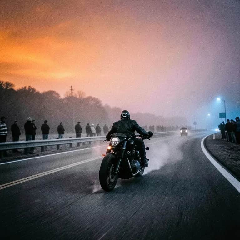 [Verse 1] Black vest, blacked-out bike Chrome teeth grin in the moonlight Skull mask cover my cold eyes Whole crew buzzin' like a beehive (yeah) Middle finger up to the turnpike We don't slow down for the blue lights Long Island look like a war zone Every back road feel like home [Chorus] Middle finger high when we roll out (roll out) Whole bar freeze when we stroll out (stroll out) Harley screamin', chaos causing, we don't hide They get quiet when they see us outside Middle finger high when we roll out (hey!) You can feel the floor start to fall out If you scared of us, better stay inside We the storm you pray just rides by [Verse 2] Walk in, doors swing, sound dies Pool cue pause in a stranger's hand Tat ink peek from the short sleeves You can taste that tension in the cheap cans Boots hit floor, then the lanes part No smile sittin' in a hard jaw If you talk slick, better talk smart 'Cause pride cut deeper than the bar brawl [Chorus] Middle finger high when we roll out (roll out) Whole bar freeze when we stroll out (stroll out) Harley screamin', chaos causing, we don't hide They get quiet when they see us outside Middle finger high when we roll out (yeah!) You can feel the floor start to fall out If you scared of us, better stay inside We the storm you pray just rides by