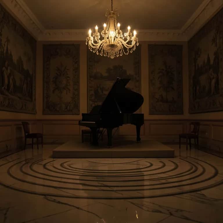 Darkly elegant chamber piece in a minor key; silver, singing piano leads with agile right-hand runs and ominous left-hand figures. Cello holds a tense, driving ostinato while viola and violins weave close-voiced harmonies and sharp accents. Flute enters as a ghostly, lyrical counter-voice, occasionally doubling and then breaking away into high, icy flourishes. Dynamic swell from hushed, suspenseful opening to a stormy, martial peak, then a poised, candlelit fade. Instrumental, 2–3 minutes, concert hall ambience., string quartet, cello