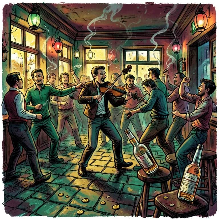 Rowdy Irish pub song, fast tempo, male/female group vocals, fiddle, accordion, stomps, claps, chaotic, comedic energy