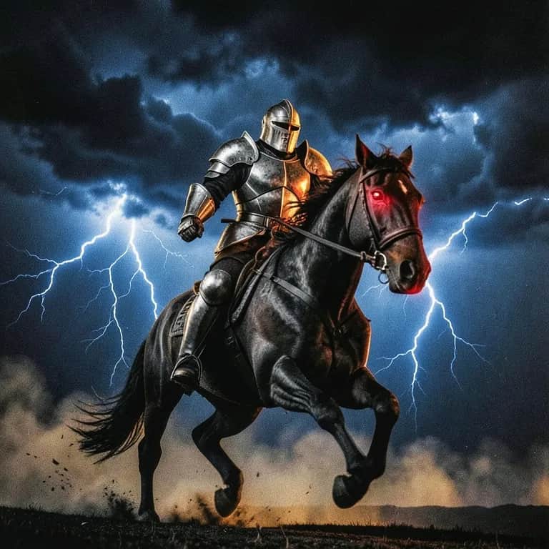 [Intro] Gallant steed beneath the stormy sky, A fearless rider, brave and high. Echoes of valor in the wind, Tonight, the legend will begin. [Verse 1] Armored beyond belief, a shining force, A crusader's heart, a relentless course. Through shadows dark and battles loud, He rides alone amidst the crowds. [Pre-Chorus] A mighty foe in the distance lurks, Thunder in the earth, the clash of works. But steadfast he stands, unbowed, unbroken, His spirit fierce, his vow is spoken. [Chorus] Ride on, oh knight, into the night, Your sword ablaze, your soul alight. Against the roar and beastly might, You won't go down without a fight. [Bridge] The slash, the roar, the fury's call, A beast so mighty, the bravest fall. Reinforcements, swift and near, Yet still he fights, despite the fear. [Outro] Though the winds may howl and the battle roar, This knight upon his steed will soar. With courage bright and armor gleam, He fights on in the warrior’s dream.