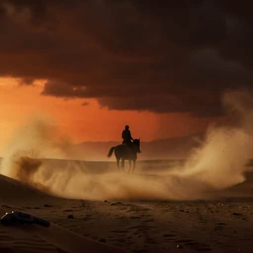 "SEIS BALAS Y UN REVOLVER" (Dark Country Rock - Neo Western Cinematico | Ritmo Acelerado y Potente) (INTRODUCCIÓN NARRADA) (Voz cargada de intensidad, con eco rápido y contundente; se oyen galopes de caballo al fondo) ¡El desierto no espera! Tres días corriendo, con el fuego del sol en mi espalda y el polvo en mis pulmones. Cien lobos me siguen a sus anchas – pero ellos no saben que corren hacia su fin. ¡Soy la tormenta que viene por ellos! (Riff de guitarra eléctrica agresivo y rápido arranca de golpe; batería a toda marcha, bajo contundente y steel guitar con ritmos vibrantes) (ESTROFA 1) (Compás rápido, rítmica como un galope desenfrenado) El sol se ahoga ¡ya! en el polvo del camino Botas rotas golpean suelo de piedra Mano en el cuero, frío como el infierno TENGO 6 BALAS Y UN REVOLVER Viento grita maldades al oído No hay escapatoria – ¡pero yo no huyo! (ESTROFA 2) (Ritmo aún más enérgico, guitarras con distorsión potente) Ojos brillantes entre cardos secos Aullidos cortan el cielo encendido PERO AFUERA HAY CIEN LOBOS QUE QUIEREN MI CABEZA No busco piedad – ¡nadie me salvará! Solo mi sombra y el eco del galope Cada latido es un grito de guerra (ESTRENO) (Coro potente, voces rasposas y contundentes) ¡NO ME RENDIRÉ! – aunque la noche se abalance ¡TODOS VAN A CAER! – bajo mi fuego implacable SEIS BALAS EN EL TAMBOR – ¡CADA UNA CON SU OBJETIVO! ¡ESTE ES MI COMIENZO O MI GLORIOSO FINAL! (PUENTE) (Riff de guitarra solista rápido y agresivo; batería con redobles potentes) El revolver canta con un estallido gutural Lobos al suelo – ¡polvo y metal! Aún quedan balas, aún quedan enemigos ¡NO HAY VUELTA ATRÁS EN ESTA CARRERA INFERNAL! (ESTRENO Repetición) (Intensidad máxima, coro amplificado con voces de fondo) ¡NO ME RENDIRÉ! – aunque la noche se abalance ¡TODOS VAN A CAER! – bajo mi fuego implacable SEIS BALAS EN EL TAMBOR – ¡CADA UNA CON SU OBJETIVO! ¡ESTE ES MI COMIENZO O MI GLORIOSO FINAL! (FINAL NARRADA) (Música sigue a toda marcha, luego se corta de golpe salvo un último redoble potente) ¡ÚLTIMO DISPARO! ¡ÚLTIMO LOBO EN PIE! Las seis balas cumplieron su ley – el desierto está pintado de rojo y gloria. ¡Nadie más se atreverá a seguir mis pasos! ¡SOY EL QUE SE ENFRENTÓ A CIEN LOBOS Y NO SE RINDIÓ! (Un riff final de guitarra eléctrica se desata y se corta bruscamente, dejando solo el eco de un galope que se aleja a toda velocidad)
