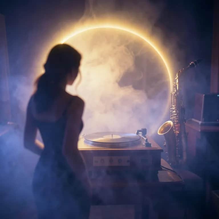 Cosmic Latin trap, saxophone, deep raspy vocals, heavy bass, atmospheric synths. Epic, romantic melancholy vibes, jazz