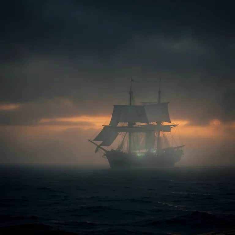 Wartime folk ballad, ghost ship, whispered myth, male chorus, acoustic guitar, fiddle, low drums, haunting chorus