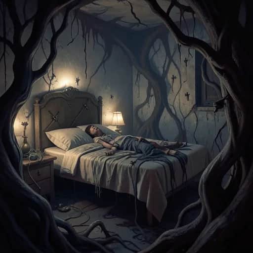 [Verse 1] I wake up choking in the dark Like something’s wrapped around my heart My body won’t obey my brain I try to scream but nothing starts The ceiling crawls The corners bend Shadows gather Crowd the bed My eyes are open Nailed in place I taste metal Static dread [Chorus] It knows my name Breathing in the walls again Pressing on my chest like blame Whispering in borrowed voices It knows my name Says it like a childhood friend Soft as if it’s all a game Holding all my choices [Verse 2] Clock red digits smear and run Mouth is desert Heavy tongue Every inhale feels too loud Like I’m begging lungs to come Footsteps in the upstairs room But I live on the second floor Something leans against my thoughts Turns the handle in my door [Chorus] It knows my name Breathing in the walls again Pressing on my chest like blame Whispering in borrowed voices It knows my name Says it like a childhood friend Soft as if it’s all a game Holding all my choices [Bridge] Is this my brain on broken glass Old fears playing puppet master Or something waiting in the cracks Learning me a little faster (oh) If I just ride it like a wave Count the cracks Repeat a phrase Will I wake up and feel okay Or bring it back by saying [Chorus] It knows my name Breathing in the walls again Pressing on my chest like blame Whispering in borrowed voices It knows my name Says it like a childhood friend Soft as if it’s all a game And I’m the one it toys with