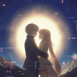 pop, Glitchy hyperpop-k/J-pop fusion with male/female vocals trading lines; bright, bitcrushed synth leads over fast kick patterns and sidechained pads, floating on a bed of distant dark-ambient choirs. Verses stay intimate and breathy, pre-chorus ramps tension with rising arps, chorus explodes into sugar-rush hooks and stacked harmonies, then drops into a dreamy half-time bridge before a final, higher-key chorus., j-pop, hyperpop, k-pop, dark ambient, anime, ambient, j-core