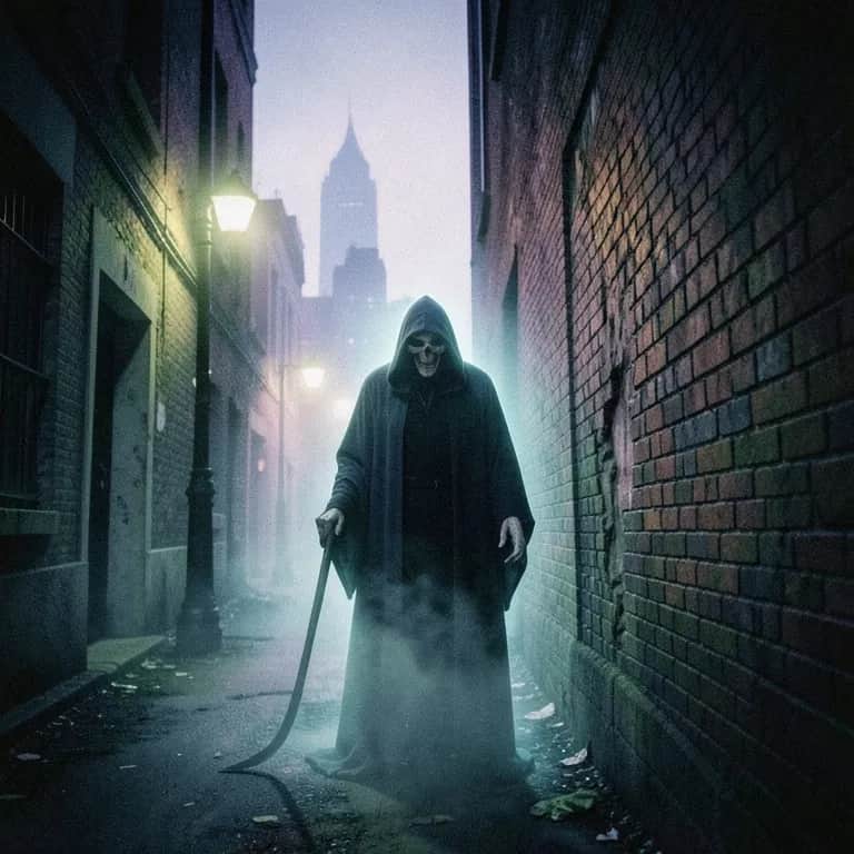 _Intro:_ In the shadows, I await your call Grim Reaper, my love, my eternal fall You sweep through towns, with your scythe in hand Leaving death and despair, wherever you land _Verse 1:_ I see you whispering, in the silence of night A dark figure, with eyes that shine like light You beckon me to follow, to the other side Where the dead reside, and the living can't hide _Verse 2:_ We're a forbidden love, a match made in hell You, the angel of death, and I, your dark spell We roam the streets, at midnight's darkest hour Leaving a trail of souls, in our deadly power _Verse 3:_ You are the devil's messenger, sent to take me away A constant reminder, of the fate that awaits I'm trapped in this cycle, of life and death's cold grasp Forever bound to you, in an eternal dance _Chorus:_ At the end of the day, you're the Grim Reaper, and you're dead You're the devil's spawn, sent to come after me You're the shadow that follows, the darkness that I see The end of my road, is where you'll be _Verse 4:_ We can't be together, in the land of the living Our love is cursed, forever unforgiving I'm a sinner, lost in the darkness of my soul And you're the one, who'll take my final breath, making me whole _Verse 5:_ In the shadows, we'll find our way Through the darkness, to a love that's here to stay But when the dawn breaks, and the sun rises high You'll disappear, and I'll be left to wonder why _Verse 6:_ You are the king, of the underworld's domain And I'm just a subject, forever bound to your reign I'll follow you, through the gates of hell Forever trapped, in this endless spell _Verse 7:_ But as the clock strikes twelve, and the night is at its peak I realize, I'll be left, when your work is done, and you'll be weak You are the Grim Reaper, and I, a mere mortal soul Forever bound, to your cold, dark role _Bridge:_ In the silence, I hear your call A whispered promise, of a love that will never fall But it's just a lie, a cruel trick of fate For in the end, you'll leave me, to face the great _Outro:_ Grim Reaper, my love, it's time to say goodbye For in the end, it's not love, but death, that will make me die