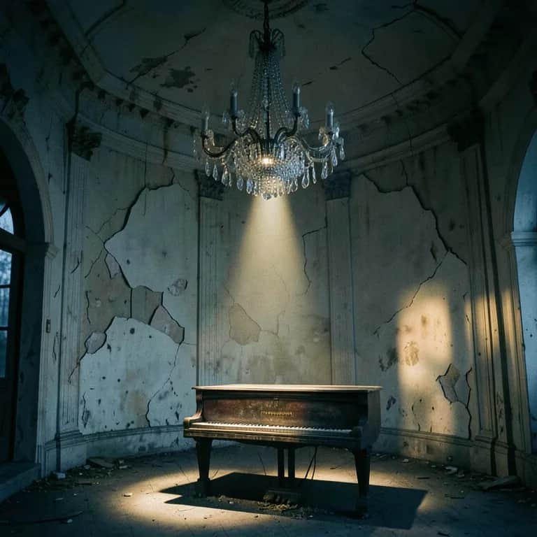 DarkCinematicPop/OrchestralSadCore Lento, pianoforte riverberato,archi cupi battito elec. cuore batte nel vuoto femina