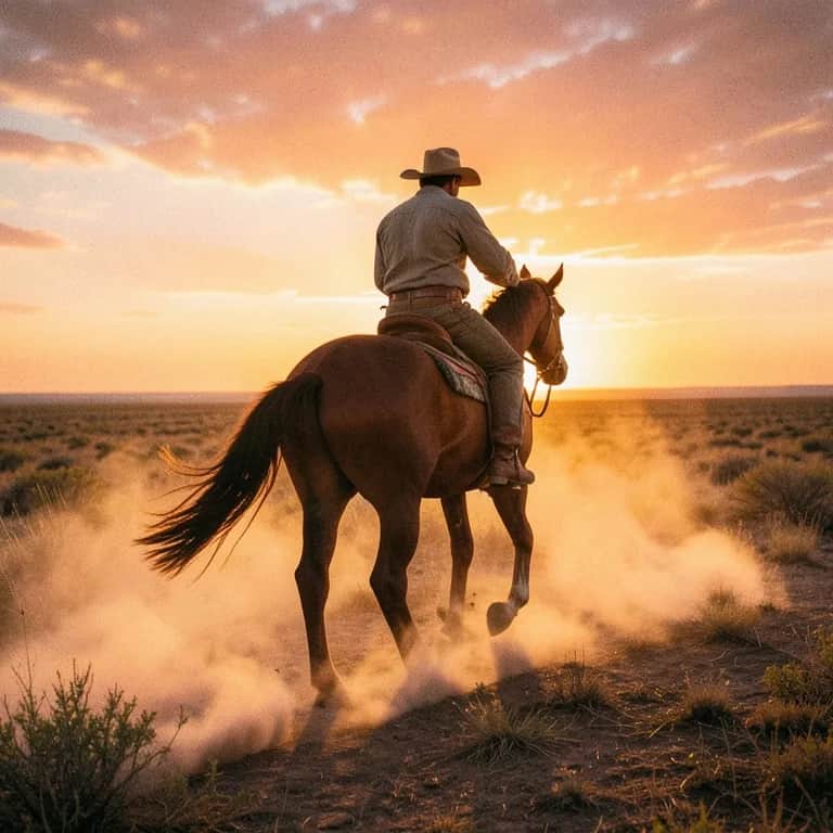 [Intro] Sunrise paints the open sky, Dust kicks up as I ride high, Freedom's whisper in the wind, Here I am, where dreams begin. [Verse 1] Leather boots and a worn-out hat, Trail is calling, can't turn back, Majestic steed beneath my hands, Riding free across the lands. [Pre-Chorus] Hear the hoofbeats, steady and strong, Heart beats like a country song, Living wild and living free, That's the life for me. [Chorus] Riding like the wind, across the plains, Chasing sunrise, breaking chains, In the countryside, where I belong, Living the cowboy life all along. [Bridge] Stars above and fields below, Night's embrace starts to show, With my horse and open road, In my heart, I've found my home. [Outro] Sand and sky become my throne, Living hard, living alone, Riding till the daylight's end, Cowboy life, my only friend.