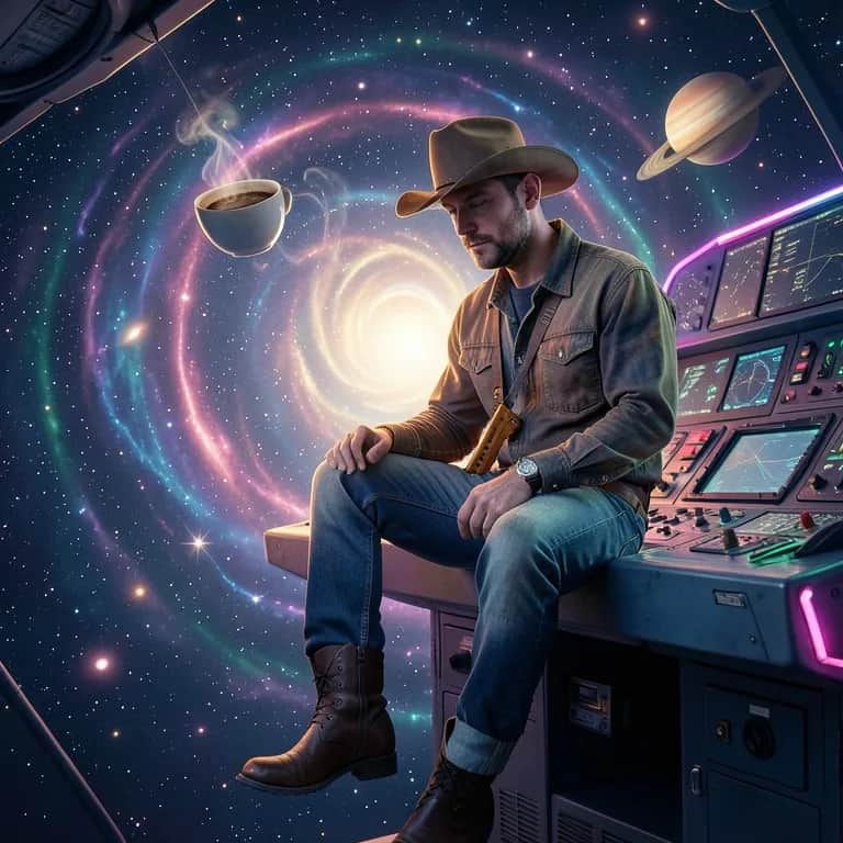 [Intro – spoken / airy] [Static on the radio… “Any cowboys out there… still ridin’?”] ⸻ [Verse 1] Wakin’ up in a tin can dawn Coffee floating, boots still on Neon planets pass me by Like old lovers fading into stars Got a map with no straight lines Every star, a different sign Heard there’s men on Orion’s belt Who kiss like trouble and burn like hell [whispers “giddy up”] ⸻ [Pre-Chorus] I’ve been drifting star to star Following a trail to wherever you are Now something in the void pulls me to you Like I’m getting close Closer to you ⸻ [Chorus] I’m your space cowboy, right by your side Shooting through the midnight sky Kiss like trouble, sparks will fly Neon saddles in the stars Stay all night, don’t say goodbye Hey space cowboy, you’re my type Hit my signal, I’ll reply Neon saddles in the stars ⸻ [Verse 2] Met you on Mars last June Danced too fast, left too soon Left his jacket in my spaceship Still thinking about his swaying hips Venus bars and laser dives Flirting just to feel alive Every port’s a “one last time” But your signal’s still on my mind ⸻ [Final Chorus – bigger] I’m a space cowboy, ridin’ with you Through the dark where the wild things bloom No more runnin’, no more void I finally found my assteroid Call me reckless, call me lost I’d cross every line no matter the costs If you’re out there, send a sign Baby, I’ll rewrite the stars in the sky (background / echo) Kiss like trouble… ride all niiiiight ⸻ [Outro – harmonica + jaw harp] [Radio crackles… “…thought I was the only one…”]