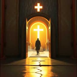rock, Aggressive hard rock, male vocals. Dark, brooding intro with distant toms, low distorted guitar drones, and whispered backing vocals. First verse in a tense half-time groove that snaps into a big, driving chorus with open hi-hats and soaring power chords. Second verse adds octave guitars and subtle choir pads for a haunted church vibe. Bridge drops to near-silence with reverb-drenched vocal, then explodes into the final chorus with double-time drums and stacked gang shouts on key lines., hard rock, clean