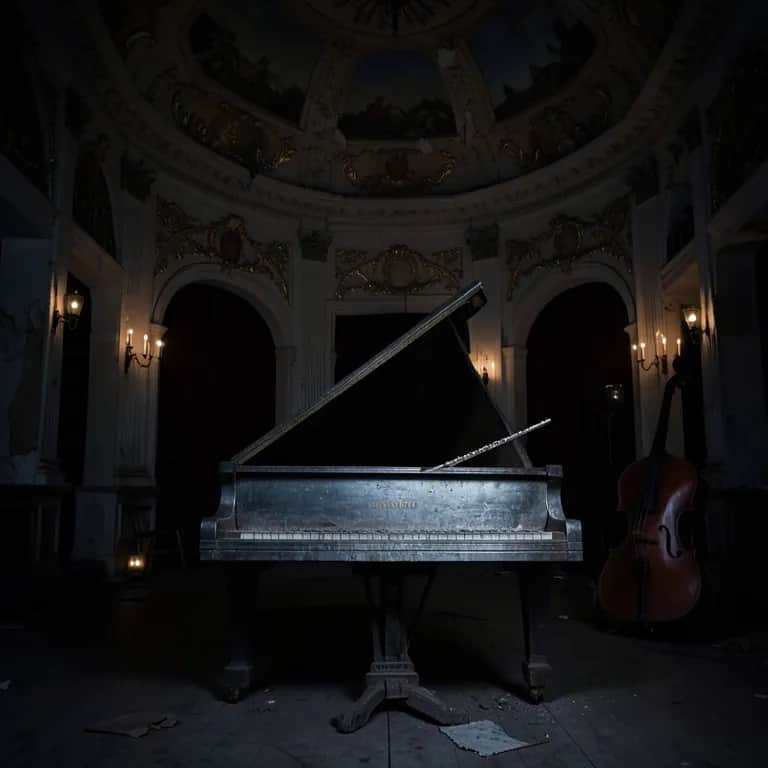 Darkly elegant minor-key chamber ensemble. Aged silver piano, driving cello ostinato, tense strings. Haunting flute.