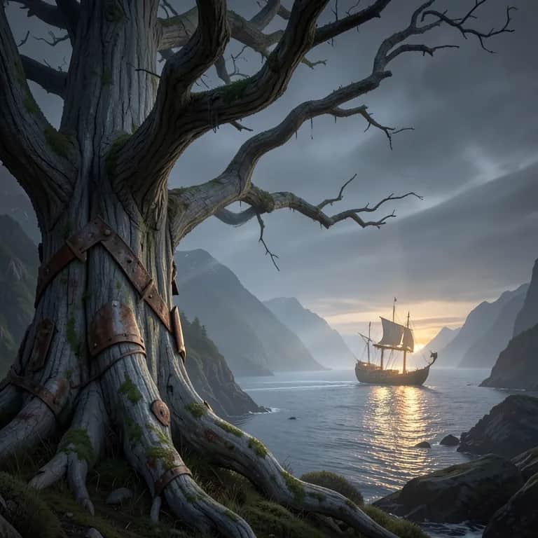 Viking rock with a chill, driving midtempo pulse and stomped toms, steady low-end bass, clean electric guitars in the verses, heavier power-chord lift in the chorus, and a rugged male vocal with double-tracked hooks. Verse stays close and spare; pre-chorus opens with rising gang chants; chorus lands wide with shouted lines. Wind chimes, horn swells, and a drum swell bridge the sections. Gritty but spacious mix, earthy and anthemic., rock