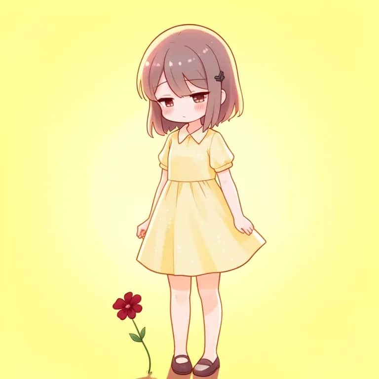 A super cute kawaii girl's voice. She's wearing a short, light cream-yellow dress. The background is a light yellow.