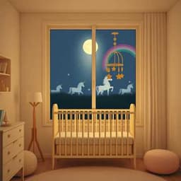 Soft lullaby with female vocals, gentle nylon guitar arpeggios and a warm upright piano pillow. Tempo sways slowly, almost rocking-chair feel. Hushed hummed motifs between lines, light glockenspiel sparkles on the word “unicorns” and “rainbows.” Subtle choir pad rises in the last chorus like a protective hug, then everything tapers to a single held note and a whispered cadence., beautiful