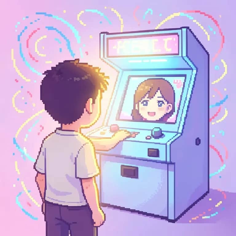 pop, Shimmering 80s pop with male vocals over bright, playful 8-bit synth arps, bouncy electronic bass, and snapping drum machine. First verse stays tight and intimate, then the chorus explodes with stacked harmonies and glittery keys. Bridge strips to pulsing pads and chiptune sparkles before a final, triumphant hook., magical