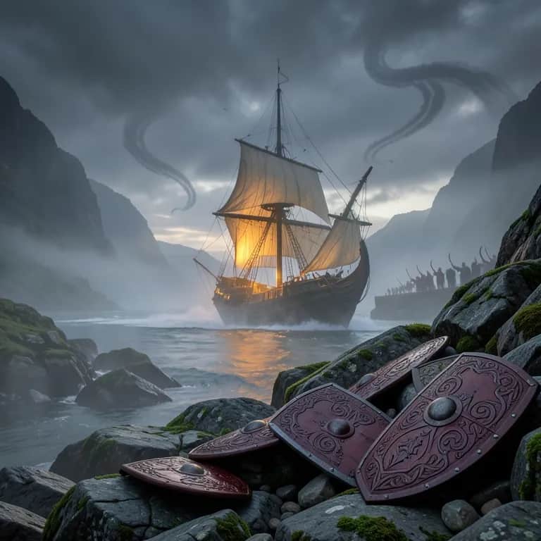 Thundering Viking war chant with huge male gang vocals and booming war drums; low horns and frame drums drive a stomping tempo, with call-and-response shouts and clashing metal layers. Verses stay raw and percussive; chorus explodes into massive unison chanting and pounding toms, perfect for a battle scene.