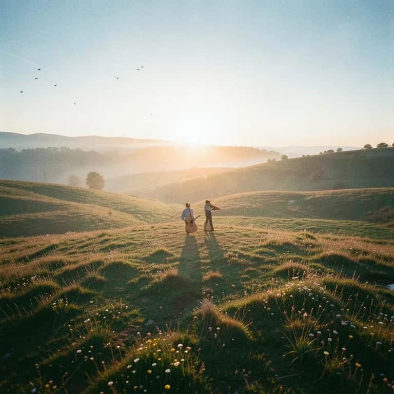 Warm Celtic fingerstyle duet on acoustic guitars, subtle nature foley (wind, distant stream, soft boots in grass). Fiddle sings long airborne phrases that bloom into lively reels for the choruses. Male vocals, intimate and close in the verses, open and ringing on the hook. Arrangement swells from sparse picking to a full, dancing jig feel, then drops back to a single guitar and voice for the final echo., celtic, fingerstyle