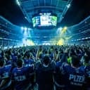 Stadium chant, hc Plzeň Škoda fans singing “Škoda olé olé”, loud crowd, drums, clapping, hockey stadium energy