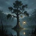 Dark gospel blues, swamp ritual vibe, banjo,stomp clap rhythm, deep bass drone, gritty female vocal, raw,haunting,chains