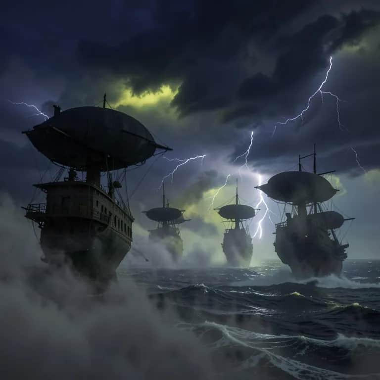 [Verse 1] Fog rolled low on Smallwater Bay Like a shroud upon the dead Five black hulls cut through the gray Where no sane soul would tread Stormbreaker led with iron will Mark never broke his stare Baywhar Babe rode cold and still With Richard standing there No bells rang, no seabirds cried Just engines droning low— Like the sky had teeth inside… And we had sailed below [Chorus] Heave away… don’t look down… Hear the dark take breath… Ice and acid raining down— Sky is sick with death… Five ships rose but the storm had more— Claws in endless form… Pray if you can… there’s no shore… In the dragonstorm… [Verse 2] They fell like rot from a broken sky Wyverns, drakes in waves Cold that burned and green that ate Turned decks to frozen graves Stormbreaker roared her thunder wide Baywhar Babe held fast But for each beast that fell and died Ten more came screaming past Three ships held the shattered line Flags in tatters torn— Till one was lost in a writhing mass And vanished from the storm [Break – Whisper] …hold fast… hold fast… …hush now, little flames… [Verse 3 – Sacrifice] A voice cut clean through fire and gale— Captain Hale stood fast: “Tell my sons I did not fail… We hold this sky our last…” A lantern flared within the swarm A spark beneath the scale— “No beast shall take us in this storm!” Cried the Wraith of Hale [Detonation] Light split wide—the sky undone Fire swallowed all— For one bright breath there burned a sun Then ash began to fall The swarm broke hard, the sky was torn The beasts fled from the flame— And four ships limped through ruin’s morn Still flying just the same [Final Chorus] Heave away… but count the cost… Hear their voices fade… Four ships live… but one is lost… In the debt we paid… Sing his name through broken storm— Let the black winds wail— For the fire that broke the swarm… And the soul of Hale… [Outro – Lullaby] If you sail where Smallwater lies And the fog won’t let you through— You’ll hear the ones who never died… Still holding line for you… Hush now, little flames… don’t you cry… Night will hold you fast… Close your eyes… the storm goes by… Fire don’t ever last…