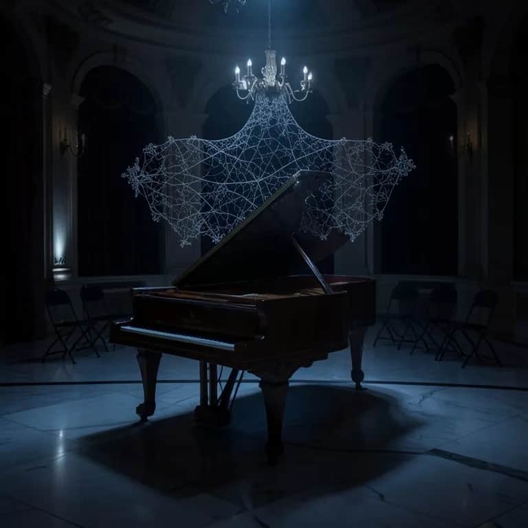 Period-accurate chamber ensemble in a minor key, led by bright yet slightly aged pianoforte; driving, ostinato cello rhythm underpins elegant legato strings and a haunting flute line. Dynamic arc rises from hushed, candlelit suspense to swirling, dance-like intensity, then returns to a poised, mysterious close. Occasional dramatic sforzandi and sudden pauses keep the tension alive, with the piano trading motifs playfully with first violin and flute., cello, string quartet