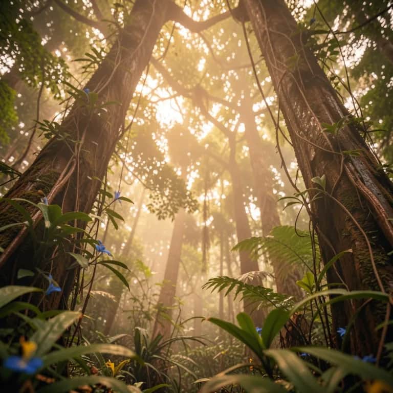 Wide stereo rainforest field recording bed: layered streams, distant thunder rolls, cicadas and birds circling the spectrum. Warm, dusty lo-fi groove slides in under the canopy with soft sidechained pads, round sub, and brushed snare. Occasional pitched percussion and glassy plucks echo like droplets; energy swells gently then ebbs, ideal looping structure with a subtle tape-warp outro., lo-fi, ambient