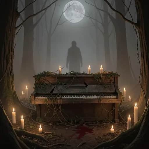 rap, Dark, cinematic hip-hop ballad over sparse, minor-key piano and deep sub-bass; downtempo drums with a single, distant gunshot FX as a recurring motif. Male vocals: intimate half-whispered verses that swell into a pained, melodic rap-hook; subtle choir pads and reverse reverb bloom in the chorus for a haunted, empty-church feel. Final chorus strips to solo vocal and piano, trailing into echo., hip hop, slow