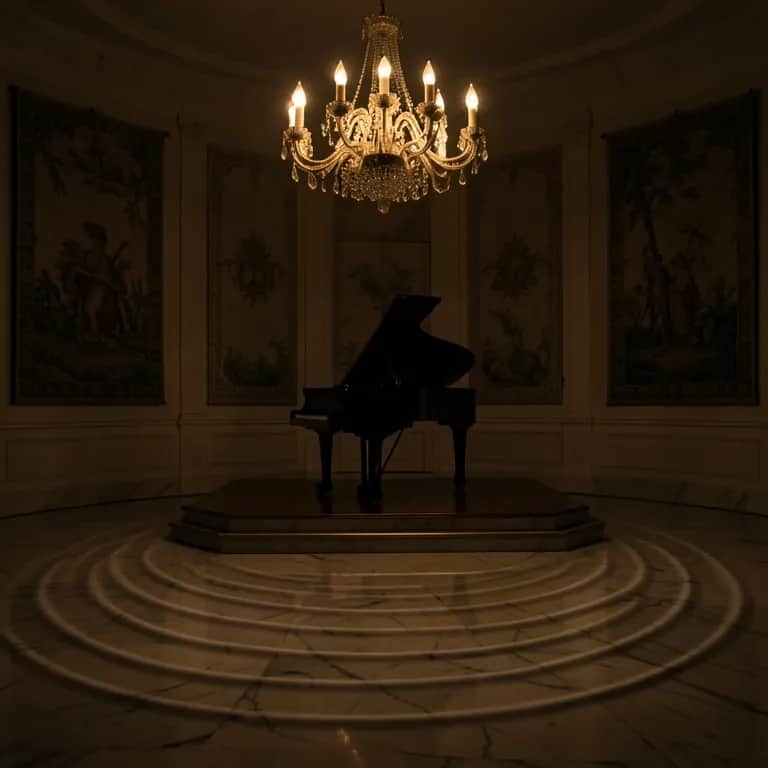 Darkly elegant chamber piece in a minor key; silver, singing piano leads with agile right-hand runs and ominous left-hand figures. Cello holds a tense, driving ostinato while viola and violins weave close-voiced harmonies and sharp accents. Flute enters as a ghostly, lyrical counter-voice, occasionally doubling and then breaking away into high, icy flourishes. Dynamic swell from hushed, suspenseful opening to a stormy, martial peak, then a poised, candlelit fade. Instrumental, 2–3 minutes, concert hall ambience., string quartet, cello