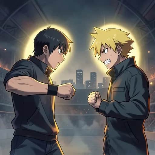 rap, High-energy anime rap cypher, hard trap drums and aggressive 808s, sharp orchestral stabs and taiko accents, male vocals trading bar-for-bar. Verses keep a tight, punchy pocket; hook jumps with crowd-chant energy and stacked gang vocals. Final section doubles tempo with ad-libs and ad‑lib callouts, leaving space for punchlines to land.