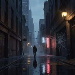 [Intro] Dark streets whisper secrets in the night Shadows cast by neon's fading light A spider's bite in the alley's gloom Unleashes chaos, shadows loom [Verse 1] In the tendrils of the smoke-filled air A detective's gaze, a silent stare Brooding in the rain, a city that bled In the dark, where angels fear to tread Uncle’s legacy, a price to pay Justice's game, in shades of gray Claws of the beast, a painful art A hero born with a broken heart [Pre-Chorus] Night falls, and the monsters crawl Silent whispers on the wall A mask behind the scarred disguise Fighting shadows in his eyes [Chorus] Dark Spider-Man, in the black and white Fighting demons in the dead of night Braving storms of the city’s sin For bloodless justice to begin Dark Spider-Man, a fearless knight Venom in his veins, fighting the blight A noir hero with a thunderous stand Master of shadows, Dark Spider-Man [Bridge] Lurking where the mobs convene Fury and silence in between Nazi shadows, gangland fears His vengeance echoes, loud and clear The devil’s riding in the tail of crime A broken hero, forged in grime No light to save, no time to run Only shadows meet the guns and guns [Outro] Dark streets whisper threats anew A hero’s vow to see it through In the black abyss, he’ll stand The rise of the Dark Spider-Man [Fingerstyle Guitar Solo] (Instrumental)}