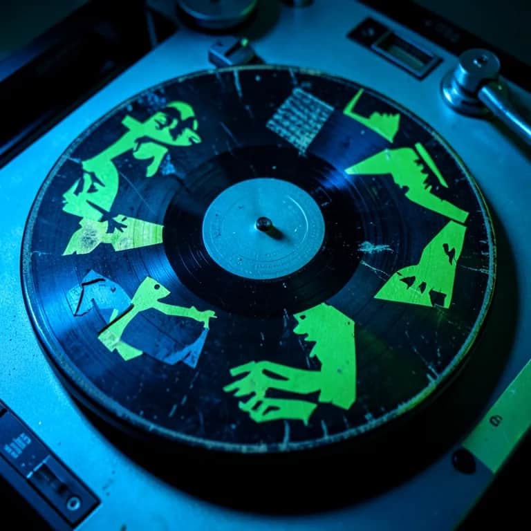 Techno, indie, synthpop banger with current radio energy; male, female alternating, hard kick bass, vinyl scratching.