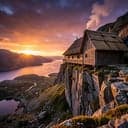 Hard Viking metal. Heavy dark guitar, deep dark male voice. Energetic.