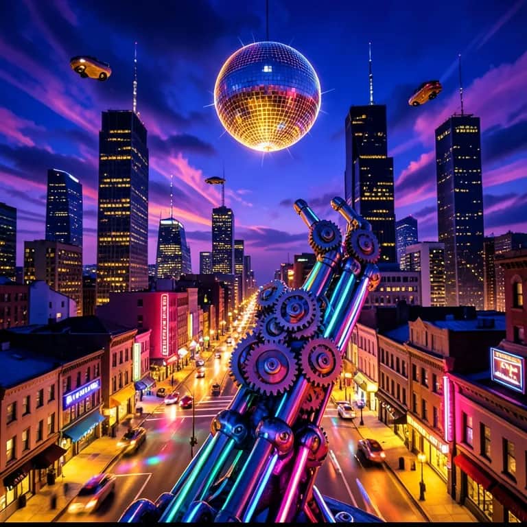 Disco, funk, retro futuristic, robotic vocals, rock, pop, bass, reggae, el guitar, trumpet, edm, chill, fun