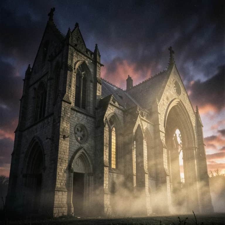 Fog-drenched dark ambient score with slow, tolling low strings, distant choirs, and ghostly female vocals floating above sparse piano clusters. Orchestral swells creep in like cold wind through stone halls; sub-bass drones and bowed metals shimmer at the edges. Reverb-soaked, glacial tempo, with vocals treated as another haunted instrument, swelling from whisper to anguished wail., slow, dark ambient, orchestral