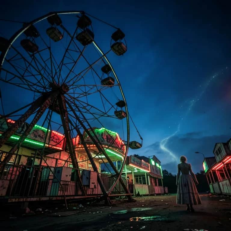 [Intro] Little lights Dead eyes Step right up To the bad side (shh) [Verse 1] Cotton candy Tastes like rust Clown in the mirror Smiling dust Ticket in my teeth I chew that fate Ringmaster’s grin On a paper plate Carousel creaks To a backwards song All of these ponies Know what I’ve done wrong Laugh track looping Over my sins Every balloon Got needles within [Chorus] Welcome to the carnival of bad dreams Where the lullabies rip at the seams Rock-a-bye baby in the guillotine swing (go to sleep) Close your eyes, hear the calliope scream (Hush now, hush now) Welcome to the carnival of bad dreams Tiny little hands on the rusted beams Count to ten, then you’ll vanish in the steam (night-night) This is where the crying learns to sing [Verse 2] Voice like velvet But the words all cut She hums a cradle song From a pickup truck Boots in the sawdust Halo tilt Lipstick smeared Like a crime scene quilt She says, “Lay down On this haystack bed I’ll braid you a crown From the thoughts in your head” Wind chimes clatter Made of old teeth Every star above Got a blade beneath [Chorus] Welcome to the carnival of bad dreams Where the lullabies rip at the seams Rock-a-bye baby in the guillotine swing (don’t you cry) Close your eyes, hear the calliope scream (Keep breathing) Welcome to the carnival of bad dreams Tiny little hands on the rusted beams Count to ten, then you’ll vanish in the steam This is where the crying learns to sing [Bridge] [whispered, panned voices] One… Two… He’s behind you Three… Four… Blood on the seesaw floor Five… Six… Shadow doing parlor tricks Seven… eight… Mama said it’s getting late [Chorus] Welcome to the carnival of bad dreams Where the lullabies rip at the seams Rock-a-bye baby in the guillotine swing (go to sleep) Close your eyes, hear the calliope scream (Hush now, hush now) Welcome to the carnival of bad dreams Tiny little hands on the rusted beams Count to ten, then you’ll vanish in the steam (night-night) This is where the crying learns to sing